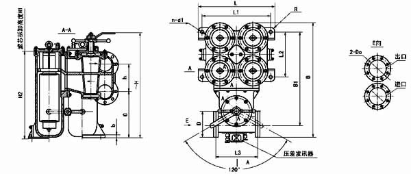 法兰标准:GB573-65(可根据需要确定):DN100、150-3 组滤芯组件 DN200-4 组滤芯组件;压差发讯器为选配件。 |