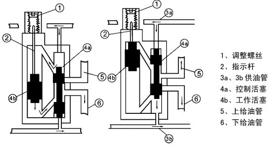 如上图所示,由泵输送来的润滑脂,经供油管3a进入分配器控制活塞的上端,控制活塞首先向下移动(这时控制活塞下端挤压的润滑脂则进入卸荷的供油管3b),使工作活塞的上腔与控制活塞的上腔连通,然后工作活塞向下移动,这时受工作活塞的挤压的润滑脂经过控制活塞的环形槽被压送到出油口6至润滑点,完成第一周期的给油动作。切换至供油管3b供油开始第二周期的给油动作,分配器活塞按相同的顺序反向进行前述动作,出油口5排送润滑脂。