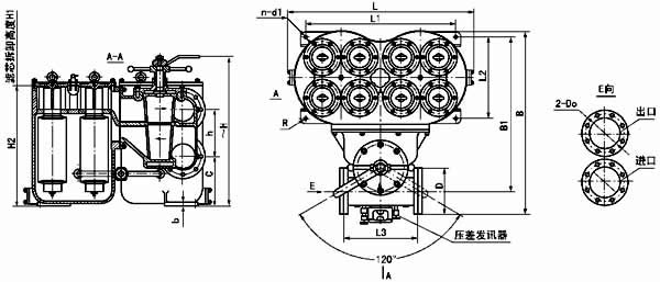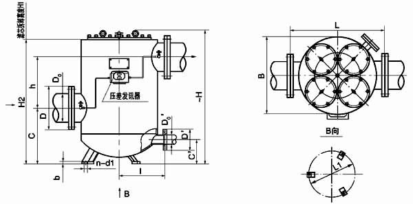 法兰标准:GB573-65(可根据需要确定):DN100、150-3 组滤芯组件 DN200-4 组滤芯组件;压差发讯器为选配件。 |